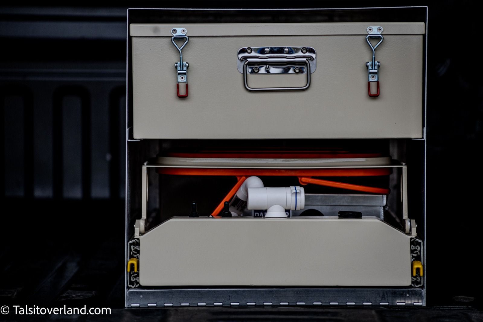 Overlanding Fuel Systems Fuel Volume If we think about overlanding in the most dramatic of ways, it could involve travel to extremely remote locations. Fuel stations are not common in remote locations, so having sufficient quantities of fuel to get to, explore, and return from your place of interest is critical. So, how to provision for adequate fuel? On Board Storage One solution to making sure you have enough fuel is to bring additional along with you in jerry cans or other fuel containers. There arise several complexities to this approach, including the safe storage of fuel—ideally, fuel should be stored outside of the vehicle. Pickup truck beds notwithstanding, many overlanding rigs are limited in where bulk stores of fuel can be placed. Storing multiple jerry cans on the roof rack is not ideal, given the dynamics of weight that high up and the impact to the vehicle center of gravity. On remote trips, particularly with gasoline engines, numerous jerry cans would be required. Adding Fuel Tanks Where space permits, increasing the size of the vehicle’s primary fuel tank is an attractive solution. Given the stock location of the tank, the vehicle dynamics would change little. Some vehicles, particularly trucks, offer as a factory option a larger tank. However, in many if not most cases, it is not possible to increase the size of the stock fuel tank. Another option is to add additional fuel tanks to the vehicle. This of course assumes there is real estate available to do so. The location of the tank would be as low as possible and therefore impact vehicle dynamics far less than when storing fuel on board. However, certain complexities arise with respect to the integration of multiple tanks such as the following. How does the additional tank connect to the vehicle fuel system? Does the tank transfer fuel to the main tank? Does the tank supply fuel to the engine? Is the fuel pump in-tank or external? Does the auxiliary tank contain a fuel level sensor? Fuel Risk Management A key element to successful remote overlanding is effective risk management. Adequate fuel provisioning is certainly one element of risk to manage. In addition, it is worthwhile to generate scenarios (failure modes) as to what could fail and leave the adventurer stranded. While modern fuel systems are certainly robust when new, a failed fuel pump could serve as a significant problem when remote. One solution is to assess the likelihood of fuel pump failure and replace it with a new one. In addition, brining along a spare pump could be money well spent. Understanding the process for changing the fuel pump is an additional risk management measure that one would be wise to consider. The process for changing a fuel pump is rather straightforward with some vehicles and difficult with others. In some cases, a nearly full fuel tank would need to be dropped in order to access the fuel pump. In addition to the pump, the risk presented by the fuel filter should be considered. A partially clogged or completely clogged filter could represent an unacceptable risk. Again, risk mitigants include changing an older filter prior to the trip, carrying a new filter on board, and an understanding of the procedure for changing the filter. Fuel lines and connectors are also a risk management consideration. Keeping some extra fuel line and any connectors that are known to fail on board are worthwhile risk mitigants. Shop Truck Fuel System Given that the shop truck was a ground-up build, we had a clean slate with which to start. We began with identifying the following initial design requirements. Fuel range of at least 500 miles loaded. Efficient change of the primary pump in field. Redundancy for in-tank fuel pump failure (multiple tanks). Integrated fuel level sensor across all fuel storage tanks. The fuel range is a function of the weight of the vehicle, fuel efficiency, travel conditions (i.e., 70 mph freeway or 55 mph back road). We settled on a 60 gallon on board capacity with the ability to carry up to an additional 24 gallons in fuel cans. Fuel System Design The LT4 engine in the truck uses its own fuel pump controller that works using pulse width modulation to supply the appropriate pressure and volume to the engine. Thus, controlling the primary pump was not a problem and amounted to connecting the wires from the LT4 fuel pump controller. The engine has an internal mechanical fuel pump that supplies the high pressures required for a direct injection fuel system. Each of the three fuel tanks contain an electric fuel pump in the tank. Each of the pumps supplies fuel to a fourth tank, which is a “fuel surge tank” that contains roughly a liter of fuel. Fuel surge tanks are commonly used in race cars that do not have a proper fuel cell to manage the effects of acceleration and cornering. In our case, the surge tank allows us to situate the primary pump up in the engine compartment where it can easily be serviced/replaced. The surge tank provides the additional benefit of guaranteeing fuel availability on severe inclines. The primary pump supplying fuel to the engine is a ‘dead end’ arrangement, where all fuel going to the engine is burned and none is returned to the surge tank. The exhibit below illustrates the fuel system in the shop truck.